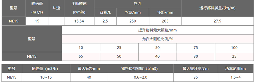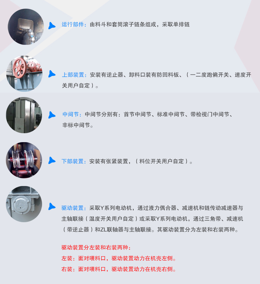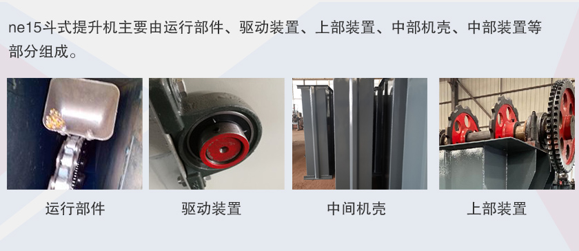 ne15斗式提升機(jī)主要由運(yùn)行部件、驅(qū)動(dòng)裝置、上部裝置、中部機(jī)殼、中部裝置等部分組成。