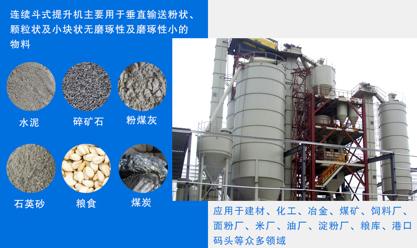 連續(xù)斗式提升機主要用于垂直輸送粉狀、顆粒狀及小塊狀無磨琢性及磨琢性小的物料,如:水泥、糧食、煤炭、粉煤灰、碎礦石、石英砂、石塊、粘土、化肥等,應(yīng)用于建材、化工、冶金、煤礦、飼料廠、面粉廠、米廠、油廠、淀粉廠、糧庫、港口碼頭等眾多領(lǐng)域。