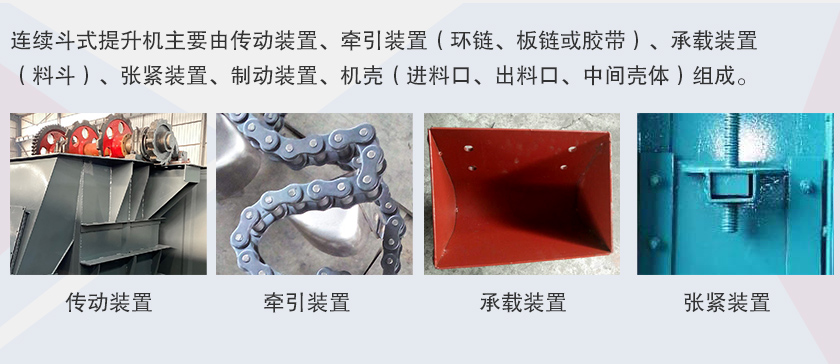連續(xù)斗式提升機主要由傳動裝置、牽引裝置(環(huán)鏈、板鏈或膠帶)、承載裝置(料斗)、張緊裝置、制動裝置、機殼(進(jìn)料口、出料口、中間殼體)組成。