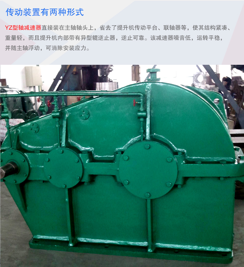 傳動裝置有兩種形式,分別配有YZ型減速器、ZQ(或YY)型減速器。YZ型軸減速器直接裝在主軸軸頭上,省去了提升機傳動平臺、聯(lián)軸器等,使其結(jié)構(gòu)緊湊、重量輕,而且提升機內(nèi)部帶有異型輥逆止器,逆止可靠。該減速器噪音低,運轉(zhuǎn)平穩(wěn),并隨主軸浮動,可消除安裝應(yīng)力。ZQ型減速器工作環(huán)境溫度為-40℃到+40℃,轉(zhuǎn)速不大于1500轉(zhuǎn)/分,齒輪傳動圓周速度不大于10米/秒,此種類型的減速器強度高,齒面磨損小,使用壽命長。