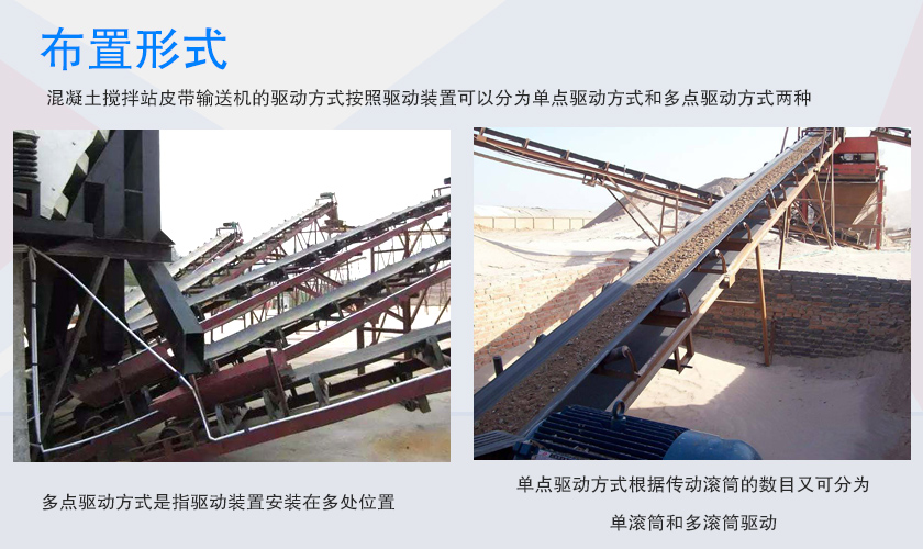 混凝土攪拌站皮帶輸送機的驅動方式按照驅動裝置可以分為單點驅動方式和多點驅動方式兩種。所謂單點驅動方式是指驅動裝置集中安裝在輸送機的某一位置,一般安裝在機頭處;多點驅動方式是指驅動裝置安裝在多處位置。通常帶式輸送機采用單點驅動方式,單點驅動方式根據傳動滾筒的數(shù)目又可分為單滾筒和多滾筒驅動,而滾筒又可由單個或多個電動機驅動。單筒、單電機驅動方式為常用的。