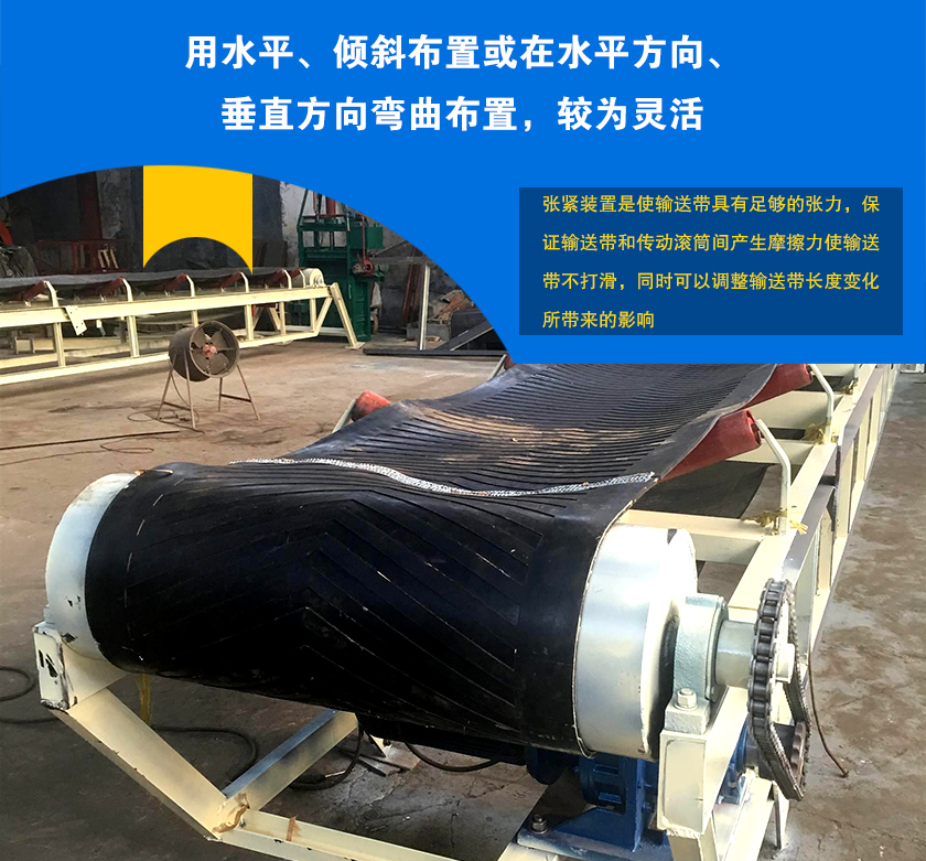 3、張緊裝置是使輸送帶具有足夠的張力,保證輸送帶和傳動滾筒間產生摩擦力使輸送帶不打滑,同時可以調整輸送帶長度變化所帶來的影響