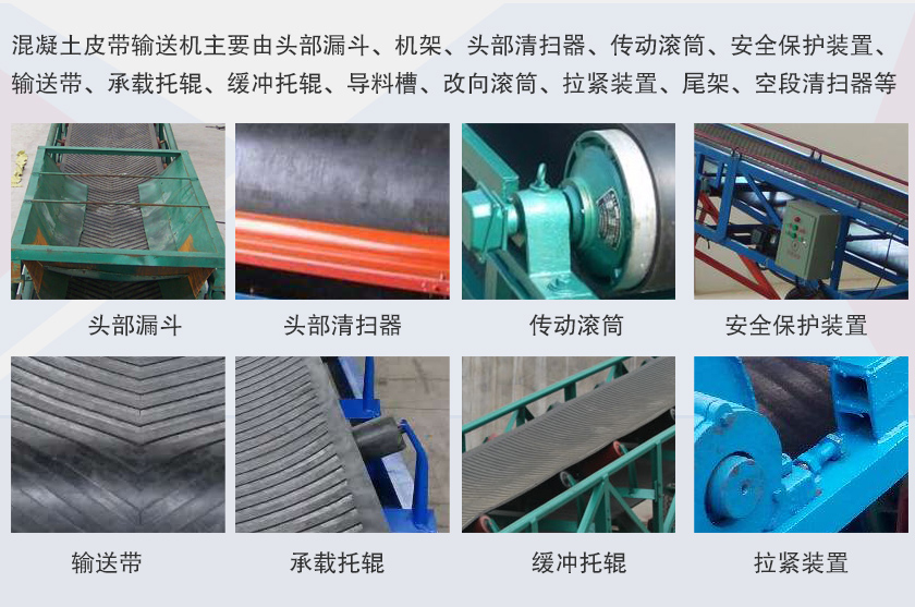 混凝土皮帶輸送機主要由頭部漏斗、機架、頭部清掃器、傳動滾筒、安全保護裝置、輸送帶、承載托輥、緩沖托輥、導料槽、改向滾筒、拉緊裝置、尾架、空段清掃器等部分組成。