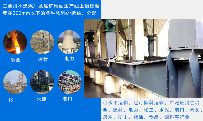 刮板鏈?zhǔn)捷斔蜋C主要用不選煤廠及煤礦地面生產(chǎn)線上輸送粒度在300mm以下的各種物料的運輸、分配。可水平運輸,也可傾斜運輸,廣泛應(yīng)用在冶金、建材、電力、化工、水泥、港口、碼頭、煤炭、礦山、糧油、食品、飼料等行業(yè)。