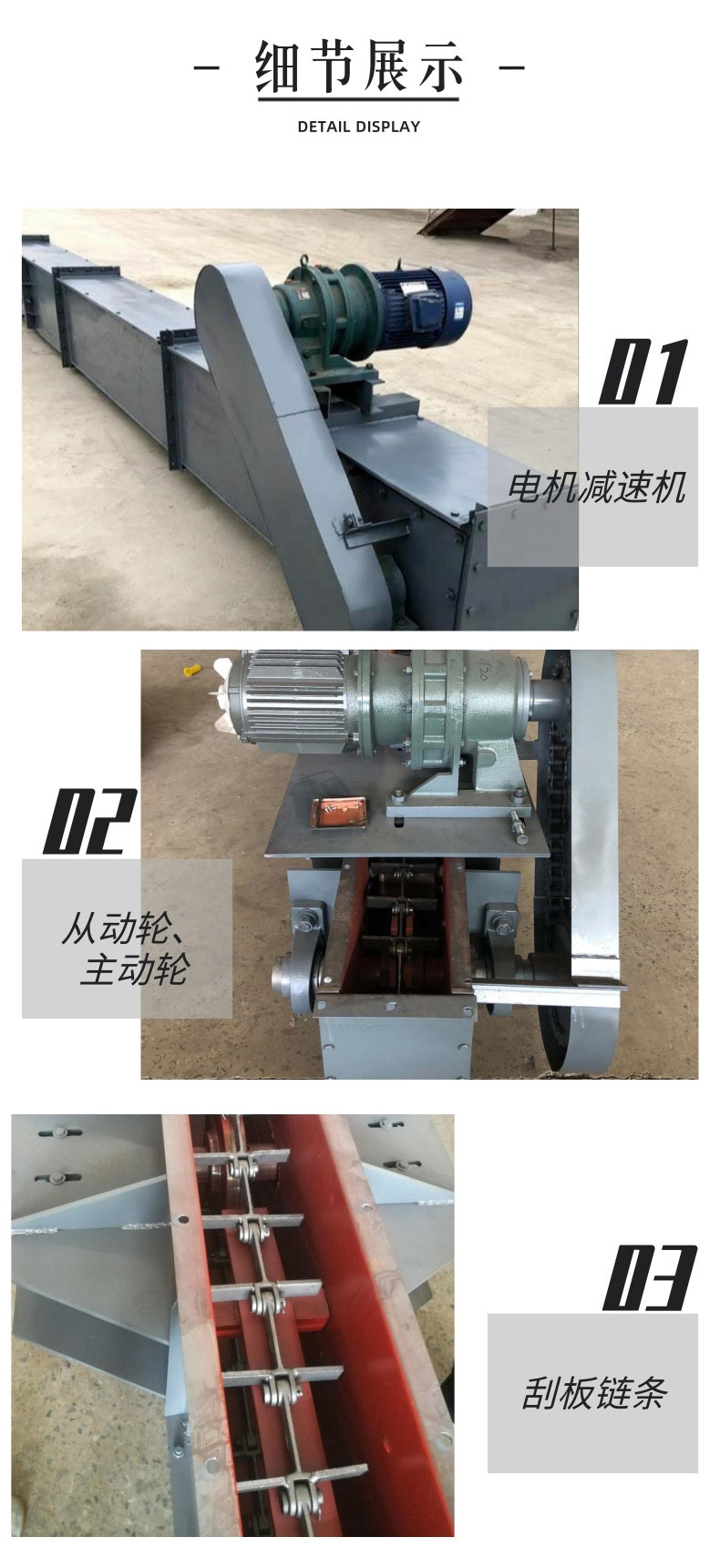 機頭:有頭架、頭輪組等組成,頭輪組是刮板鏈運行的傳動部件,主要由主軸、軸承、軸承座、鏈輪等組成,機頭的尾部與中間槽法蘭聯(lián)接。