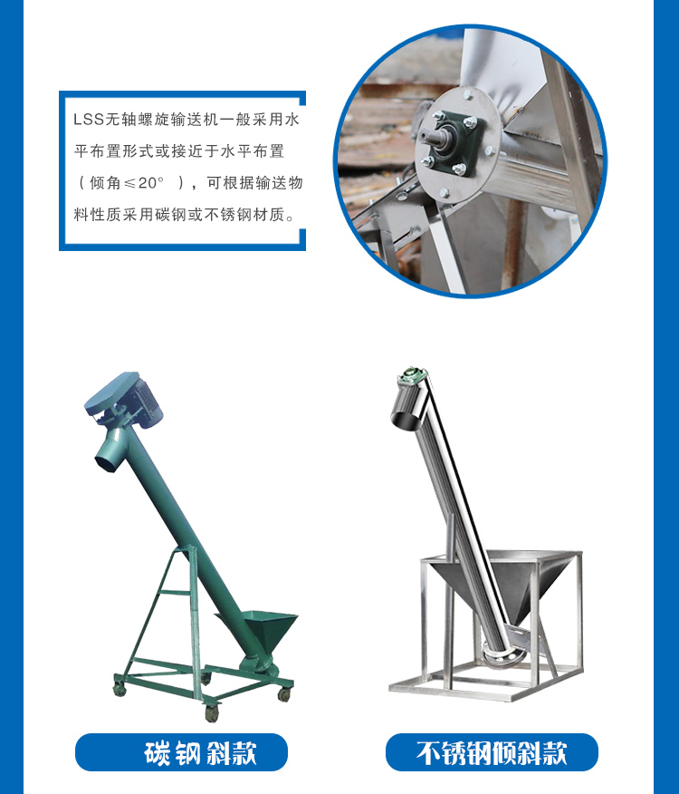 LSS無軸螺旋輸送機一般采用水平布置形式或接近于水平布置(傾角≤20°),可根據(jù)輸送物料性質(zhì)采用碳鋼或不銹鋼材質(zhì)。