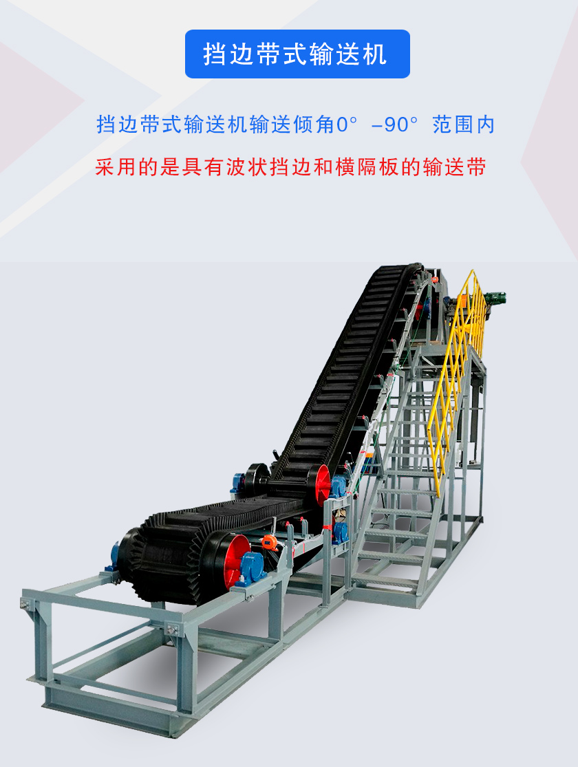 擋邊帶式輸送機(jī)具有波狀擋邊和橫隔離板的輸送帶,適用于大傾角連續(xù)輸送散裝物料,擋邊帶式輸送機(jī)的輸送帶兩則有波狀紋的擋邊,皮帶中間部位有橫隔板,在輸送物料的過程中不容易撒料和下滑,適用于大傾角連續(xù)輸送散狀物料。