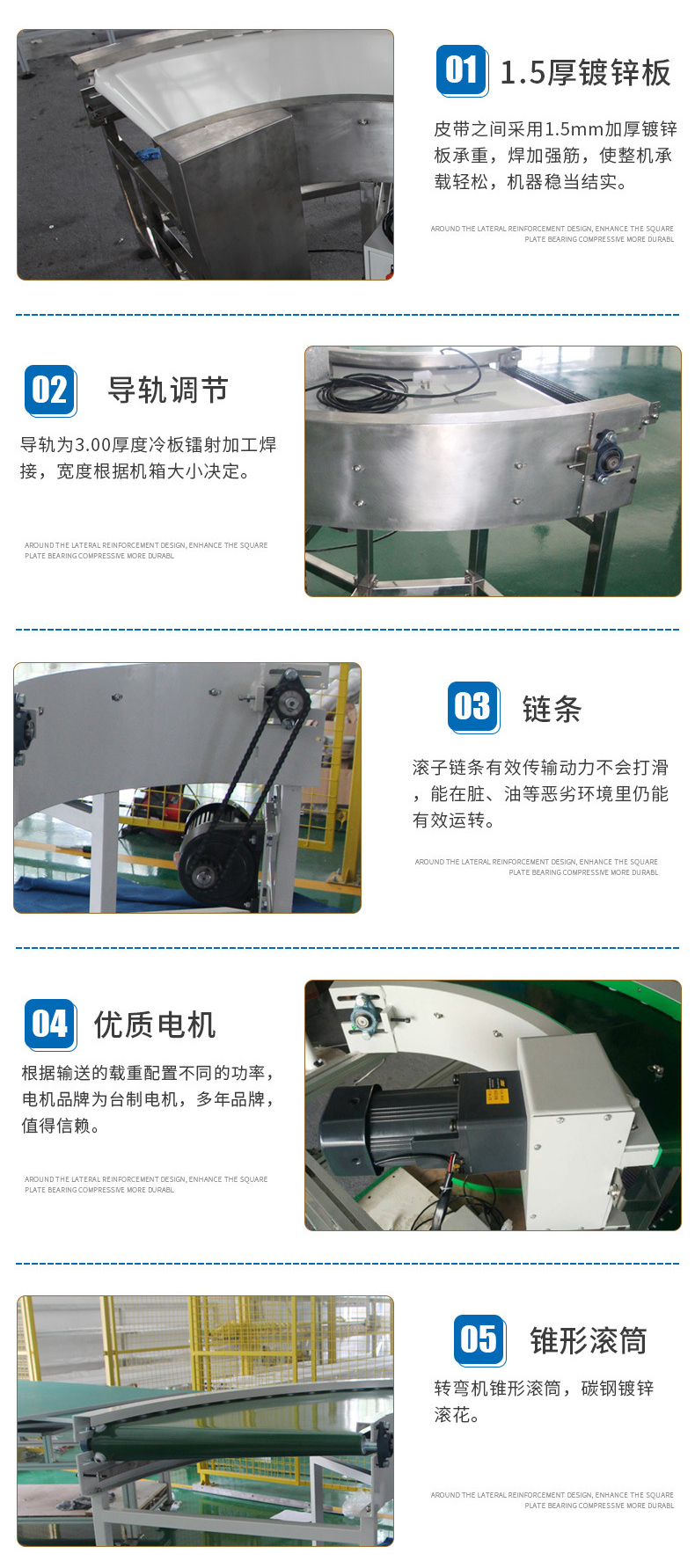 1、相較普通輸送機(jī)增加轉(zhuǎn)彎功能,可滿足各種輸送工藝要求。