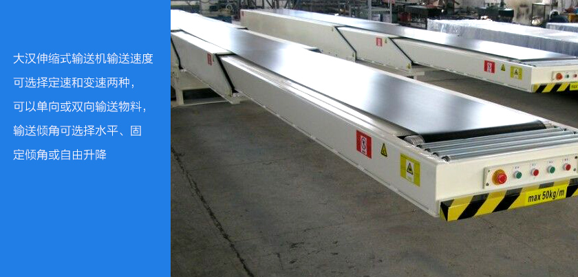 大漢伸縮式輸送機(jī)輸送速度可選擇定速和變速兩種,可以單向或雙向輸送物料,輸送傾角可選擇水平、固定傾角或自由升降