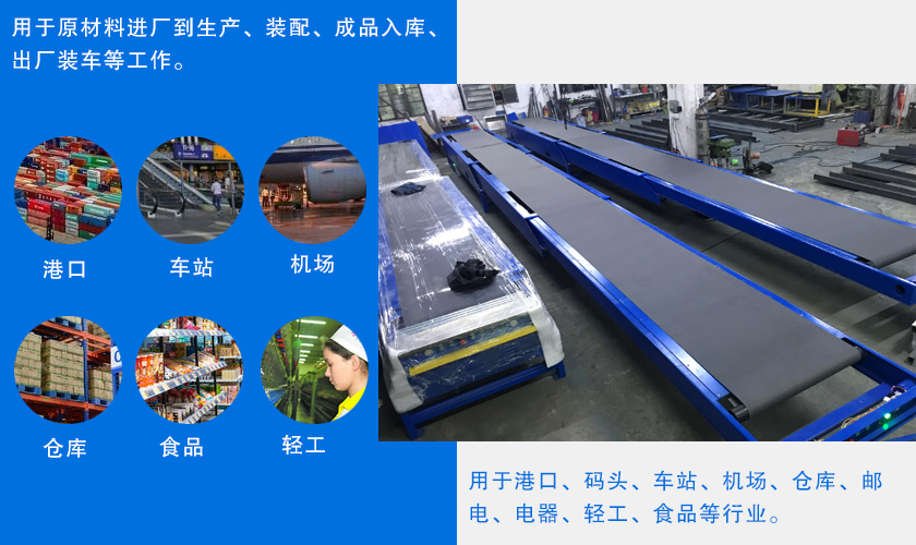 伸縮式皮帶輸送機(jī)可應(yīng)用于港口、碼頭、車站、機(jī)場、倉庫、郵電、電器、輕工、食品等行業(yè)。完成物品或零件的傳輸,裝卸工作,使用于原材料進(jìn)廠到生產(chǎn)、裝配、成品入庫、出廠裝車等工作。