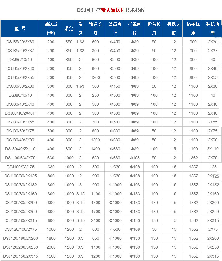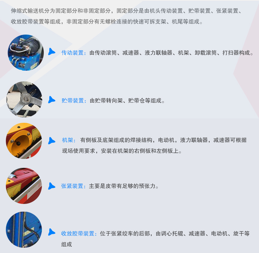 伸縮式輸送機(jī)分為固定部分和非固定部分,固定部分是由機(jī)頭傳動裝置、貯帶裝置、張緊裝置、收放膠帶裝置等組成,非固定部分有無螺栓連接的快速可拆支架、機(jī)尾等組成。