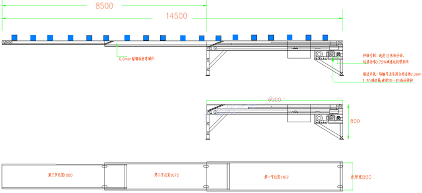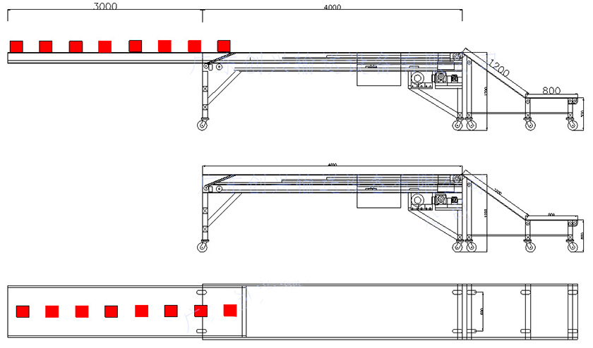 2、可按照用戶要求調(diào)節(jié)按鈕,隨時控制輸送機(jī)的長度,底部安裝升降裝置殼隨時控制輸送機(jī)端部的高度。