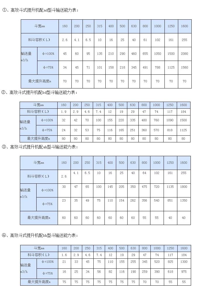 配置不同的料斗,其輸送能力不同,故將高效斗式提升機技術(shù)參數(shù)表列為四種: