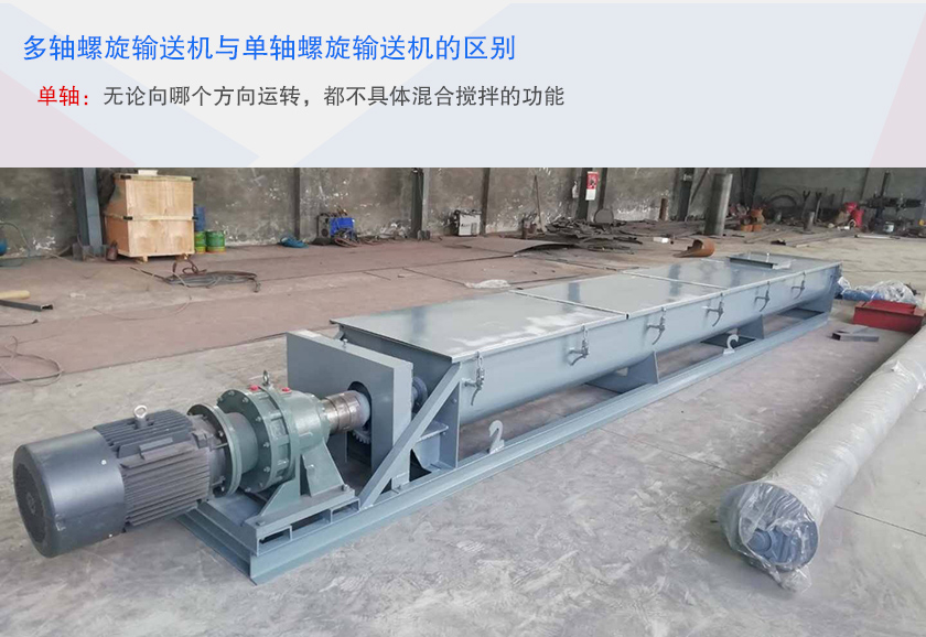 多軸螺旋輸送機(jī)與單軸螺旋輸送機(jī)相比多幾個螺旋軸,輸送機(jī)量大一倍以上,對于客戶來講,更省時間,更增產(chǎn)量,還具有攪拌功能,單軸螺旋輸送機(jī)無論向哪個方向運(yùn)轉(zhuǎn),都不具體混合攪拌的功能,而多軸螺旋輸送機(jī)則是兩邊螺旋軸轉(zhuǎn)向不同的方向(注:都向內(nèi)側(cè)轉(zhuǎn)動)。所以當(dāng)物料放入進(jìn)料口時,會自動將物料轉(zhuǎn)動到中間,混合到一起。