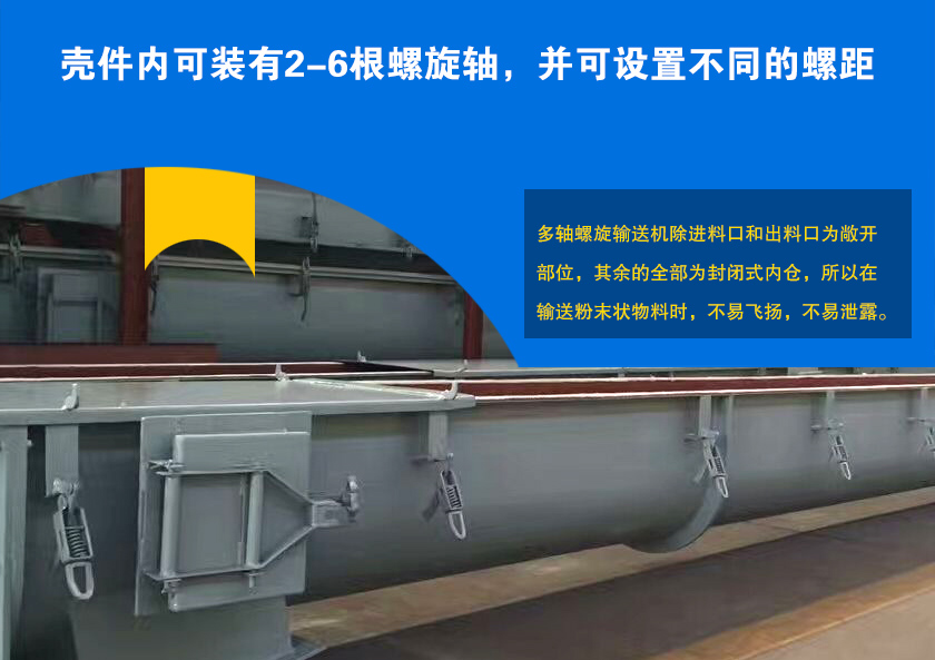 多軸螺旋輸送機(jī)采用2根以上螺旋軸,與單軸螺旋輸送機(jī)相比具備攪拌作用,輸送傾角一般不超過20°,輸送距離在40米左右.多軸螺旋輸送機(jī)采用封閉式輸送,無粉塵污染.