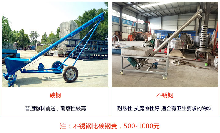 移動(dòng)螺旋輸送機(jī)分為碳鋼和不銹鋼兩種,同一型號(hào)下,碳鋼材質(zhì)的移動(dòng)螺旋輸送機(jī)會(huì)比不銹鋼材質(zhì)的便宜500-1000元。