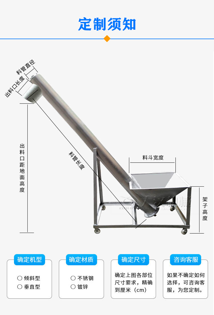 移動(dòng)螺旋輸送機(jī)長(zhǎng)度(進(jìn)、出料口的距離)越長(zhǎng),價(jià)格越貴,超過10米的,傳動(dòng)形式復(fù)雜的,價(jià)格需要另外核算。