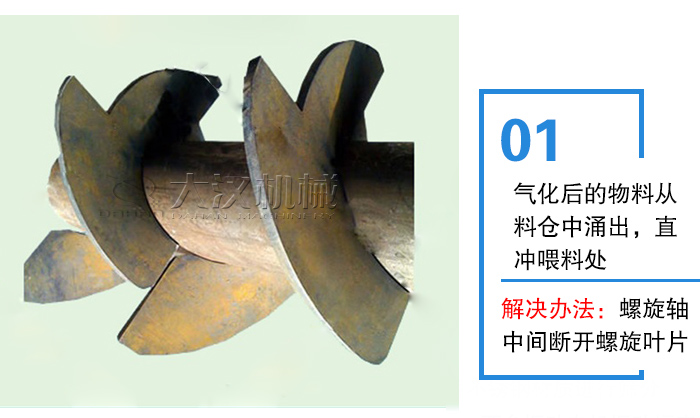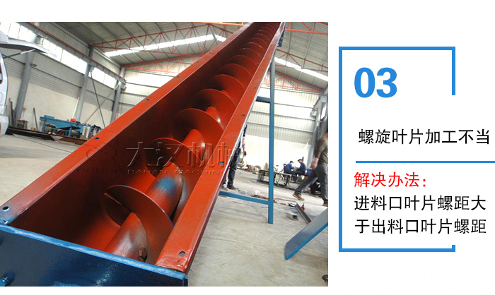 解決辦法:對(duì)于較長(zhǎng)的螺旋輸送機(jī)可采取逐漸增大的螺距,防止輸送機(jī)在喂料處被物料淹沒(méi)而產(chǎn)生的過(guò)負(fù)荷,也可防止氣化后物料從料倉(cāng)中向外涌出。