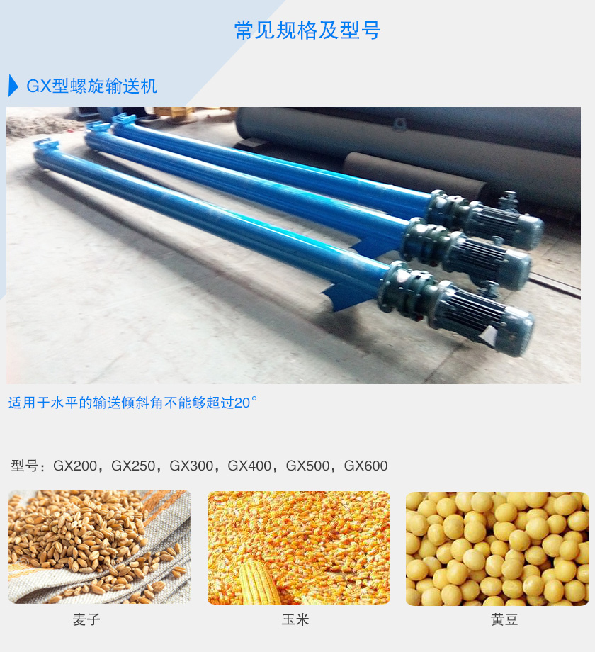 GX型螺旋輸送機是較老的螺旋輸送設(shè)備,其有單管于雙管兩種形式,適用于水平的輸送傾斜角不能夠超過20°。可輸送一些塊狀的(小塊狀物料)例如:麥子,玉米,黃豆等糧食。