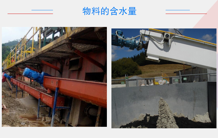 物料含水量的高低會影響螺旋輸送機輸送效率,含水量高,物料在輸送過程中極易粘附在螺旋葉片上火輸送機內壁上,長此以往,粘附在葉片和內壁上的物料會增多,造成堵網現象,大大降低螺旋輸送機的輸送量,長久黏附的物料還需要進行人工清除。